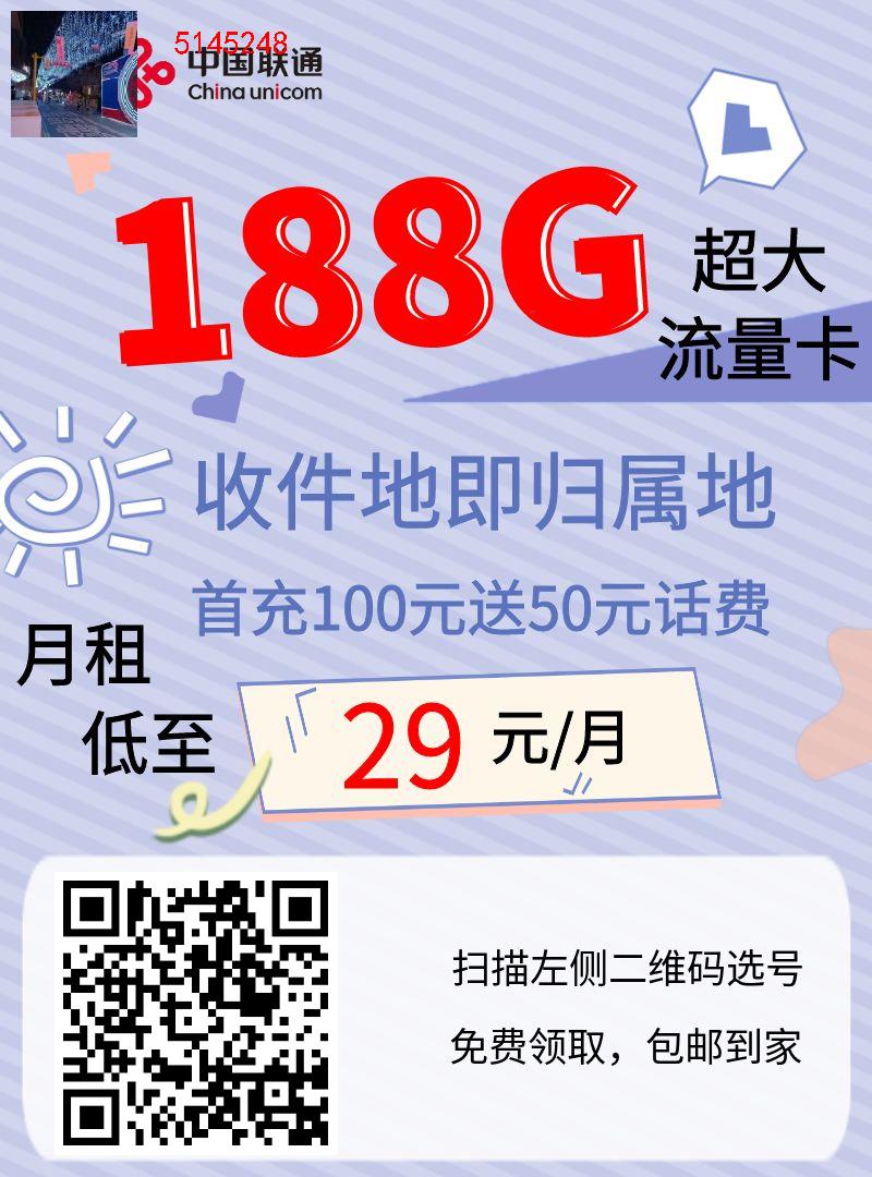 1.188G大流量王卡,月租最低29元,包含158G全国通用流量+30G定向流量。详情请看领取页面。